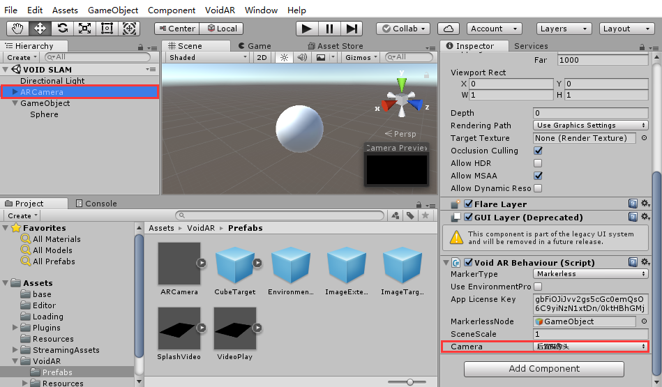 返回Unity,选中ARCamera,查看右侧的Inspector栏,继续完成“App License Key”的设置。